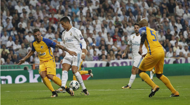 腾讯体育9月14日讯 欧冠首战皇马3-0大胜,C罗罚中一粒点球,皇马欧冠史上已获得44个点球,追平巴萨并列历史第一。这次点球判罚很有争议,之后C罗还曾在禁区内被对手绊倒,但主裁并未判罚第2个点球。