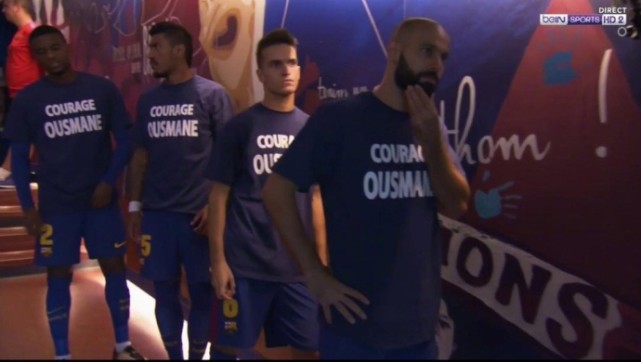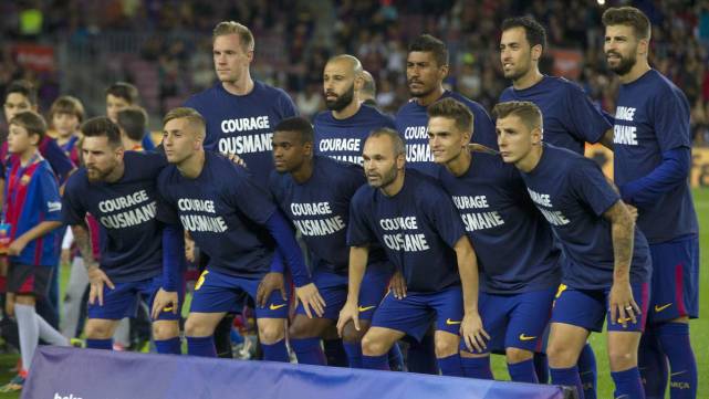 在周二晚间主场迎战埃瓦尔的西甲联赛开赛之前,巴塞罗那球员身披特别款蓝色T恤衫走上了诺坎普球场的草坪,该件T恤衫上印有法语“Courage Ousmane(勇气十足的登贝莱)”。在今夏转会市场上,巴塞罗那斥资1.05亿欧元方才得到了登贝莱(转会费总额有望达到1.5亿欧元),红蓝群星希望以这样的一种方式,来鼓励该名法国国脚前锋勇敢的面对自己的伤势,并且尽快重返绿茵场。