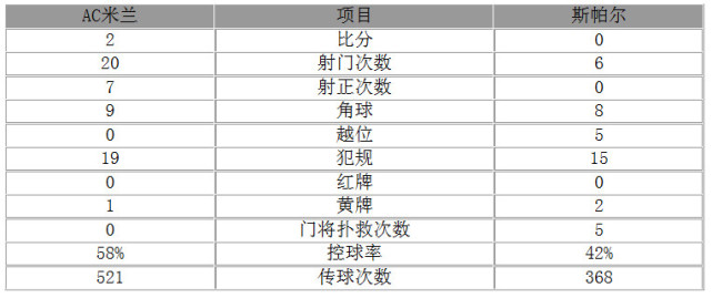 米兰占据场面的绝对优势,射门数遥遥领先,斯帕尔队全场比赛未能有一次射正,红黑军赢得完胜实至名归。