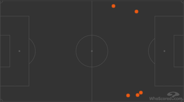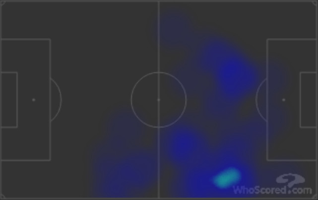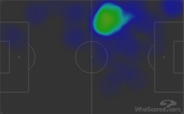 从活动热图上来分析,里贝里最主要的活动区域在中场偏左的位置上;换言之,与其说他在本场比赛中打的的左边锋,还不如说是左前卫。曾几何时,“刀疤”是国际足坛突破能力最强、“爆破威力”最大的边路球员,可是在年满34岁之后,我们依然能够感受到他在比赛中的无力感。