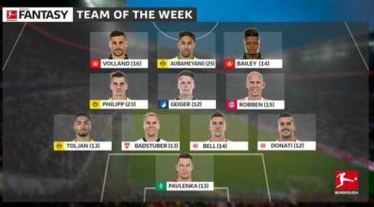 腾讯体育9月25日讯 德甲官网公布了德甲联赛第6轮最佳阵容,奥巴梅扬领衔多特蒙德3人入围,拜仁只有罗本入选。
