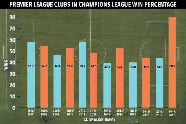 《太阳报》指出,英超俱乐部本赛季的表现与之前几个赛季的状态形成了鲜明的对比。上赛季同期,英超俱乐部的胜率仅有43.8%,热刺未能跻身淘汰赛,而曼城和阿森纳也在八分之一决赛就被淘汰。在最近几个赛季,来自西甲的巴萨、皇马以及来自德甲的拜仁慕尼黑包揽了冠军,而马竞、多特蒙德、摩纳哥和尤文图斯也明显提升,英超俱乐部则无法达到同样的水准。
