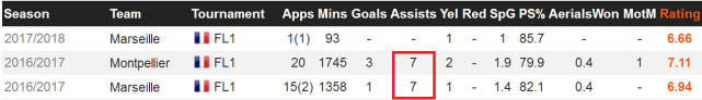上赛季,半程便奉献7次助攻的桑松在助攻榜上一骑绝尘,蒙彼利埃也在连年失血、开局不利的情况下稳坐中游。眼见桑松表现优异,美国老板弗兰克·麦考特收购后一改前东家玛格丽特·德雷福斯时紧缩银根政策的马赛,向桑松抛出了橄榄枝。900万欧元固定转会费+300万欧元浮动,桑松就此披上白色战袍,在完全不熟悉队友的情况下,没有任何磨合期的桑松交出了与半程相同的7次助攻,并以14次助攻问鼎法甲助攻王,马赛也以第五名跻身欧联杯。