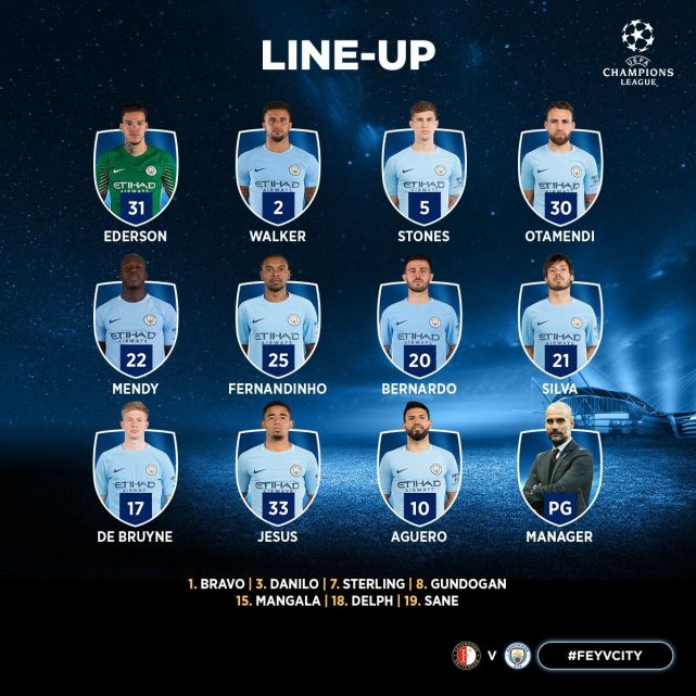 腾讯体育9月14日讯 北京时间凌晨2时45分,欧冠小组赛F组一场焦点战在荷兰鹿特丹打响,曼城客场对阵费耶诺德。赛前双方首发阵容已公布。曼城方面派上攻击杀阵,热苏斯、阿圭罗二人统率锋线,同时贝尔纳多-席尔瓦、大卫-席尔瓦、德布劳内等攻击手出场,斯通斯与奥塔门迪组成中卫搭档,门将埃德森虽然上周末联赛缝了八针,但此战仍然领命上阵。