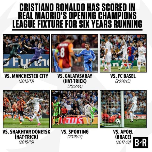 面对希腊人竞技,是C罗在145场欧冠的第136次首发,这让他超越了劳尔的135次,创造了非门将球员欧冠首发纪录,而在所有球员里,他也仅次于卡西利亚斯的164次。在第12分钟破门后,C罗刷新了自己保持的连续五个赛季欧冠首战破门的纪录,最近六个赛季,C罗在欧冠首战一共打入了11球,场均进球接近2个,此前面对里斯本竞技、巴塞尔、顿涅茨克矿工、加拉塔萨雷和曼城,C罗都有进球,其中两次还有过帽子戏法的发挥。