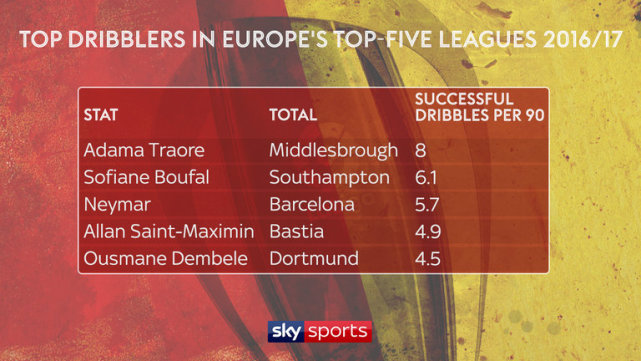 对巴萨来说,他的盘带最有吸引力。在恩里克执教时,内马尔的一对一能力是巴萨战术体系的重要组成部分,而登贝莱拥有同样的速度和技巧。数据显示,内马尔上赛季完成了168次成功盘带,而登贝莱仅有104次,但以平均90分钟之内的数据来看,两人的差距并不大。内马尔上赛季平均90分钟之内有5.7次成功盘带,在欧洲五大联赛排名第三位,而排名第五位的登贝莱则是4.5次。