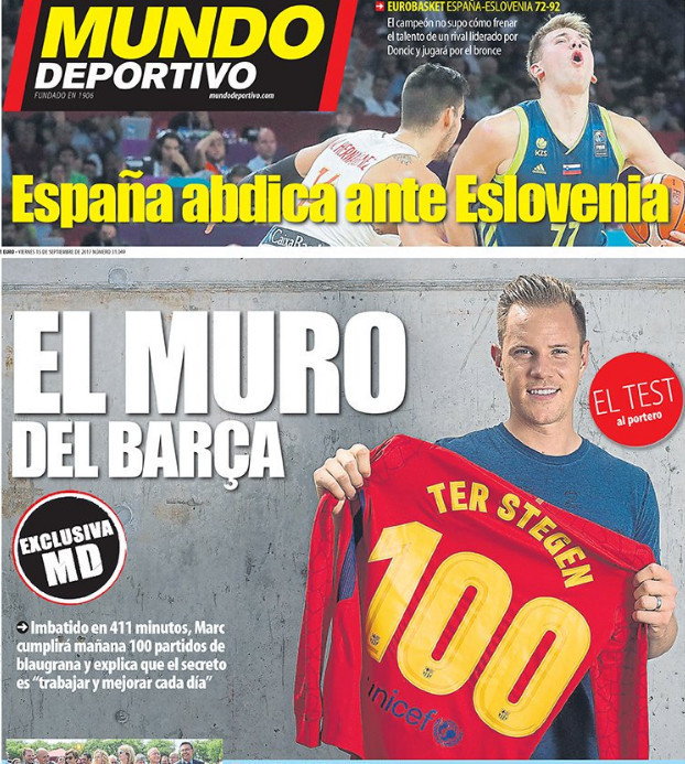 此役将是特尔施特根加盟巴萨后各项赛事第100战,落户诺坎普前3个赛季,小狮王分别出战21场、26场与46场,上赛季开始确立主力地位。德国替补国门之前在5项赛事中亮相99次,丢95球,联赛46战丢40球,欧冠33战丢31球,国王杯16战丢11球,西班牙超级杯3场丢9球,欧洲超级杯1战丢4球。