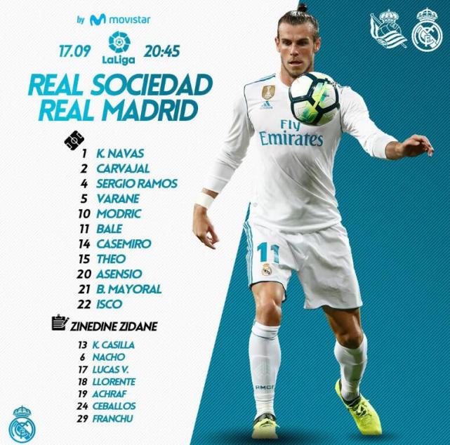 皇家马德里(4-4-2):纳瓦斯;卡瓦哈尔,瓦拉内,拉莫斯,泰奥-埃尔南德斯;伊斯科,莫德里奇,卡塞米罗,阿森西奥;贝尔,马约拉尔