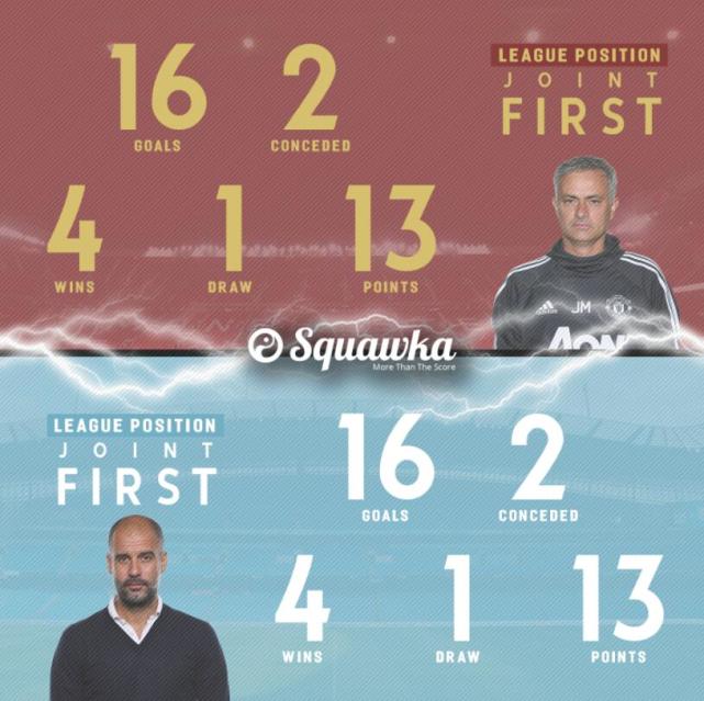 前五轮战罢,曼市双雄都取得了4胜1平积13分的成绩,让人惊讶的不仅仅是两支球队积分相同,而且在进球数(16球)、净胜球数(14球)上全都相等。要想给曼市双雄在英超积分榜上准确排出位次的话,只可能通过双方球队之间的字母顺序来进行区分。