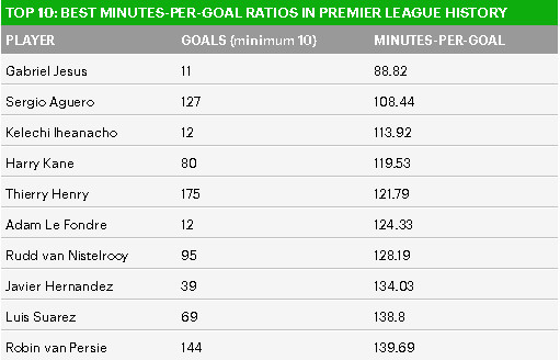 《每日邮报》的这份统计中,球员在英超的进球数至少超过10个。热苏斯自从今年1月份加盟曼城以来,已经打进了11粒联赛进球,用时仅977分钟,平均每88.82分钟就能打进一球,目前是英超的效率之王。