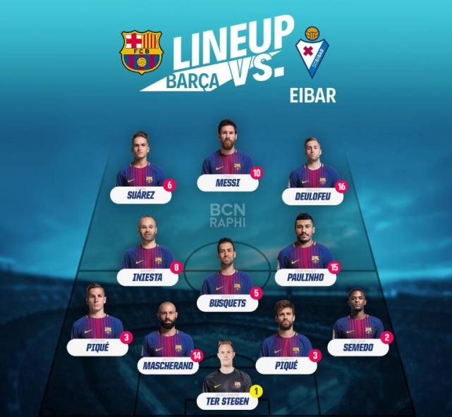 巴塞罗那(4-3-3):特尔施特根;塞梅多,皮克,马斯切拉诺,迪涅;保利尼奥,布斯克茨,伊涅斯塔;德乌洛费乌,梅西,丹尼斯-苏亚雷斯