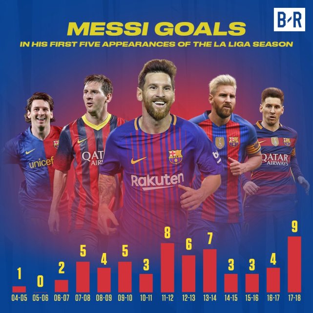 梅西在2004-05赛季开始上演西甲首秀,在那个赛季,梅西还只是巴萨阵中的小字辈,当时梅西在前五轮联赛不过打入了1球。到了2005-06赛季,梅西在前五轮甚至没有进球。2006-07赛季,梅西在前五轮打入2球。随后,在2007-08赛季,梅西就开始展示自己嗜血的杀手本能,他在前五轮联赛打入了5球。