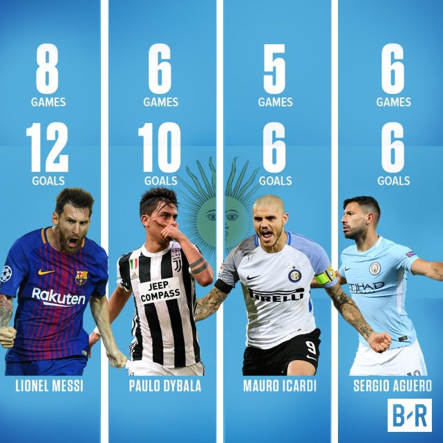 腾讯体育9月21日讯 在9月份进行的两场世界杯预选赛上,阿根廷遭遇了两场平局,目前在世预赛南美区积分榜上,阿根廷依然只能排名第五位(南美洲前四直接晋级,第五需要参加附加赛)。阿根廷的低迷和射手们不进球有关,因为在16场世预赛里,阿根廷仅仅打入16球,场均不过1球。不过回到各自俱乐部,阿根廷的国脚们却生龙活虎,梅西、迪巴拉、伊卡尔迪和阿圭罗在26场比赛轰下来到34球,他们也占据了三大联赛的射手榜第一宝座。