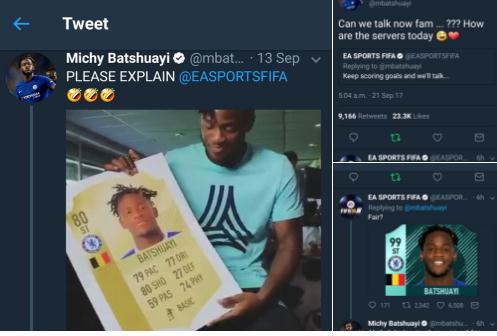 腾讯体育9月21日讯 足球是世界第一大体育运动,在全世界拥有着无数的球迷,而EA公司的FIFA系列足球游戏也在全世界拥有众多的玩家。每年的FIFA大作中,球员的能力值都非常引人关注。据英国媒体《每日邮报》的消息,切尔西前锋巴舒亚伊对FIFA游戏对自己能力的设定并不满意,两者也进行了一番有趣的互动。