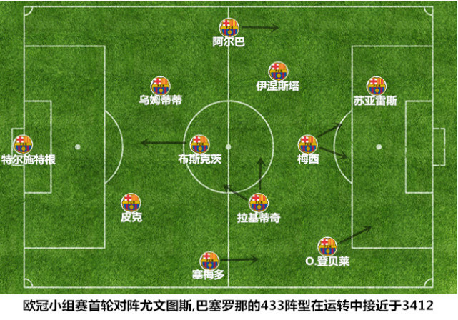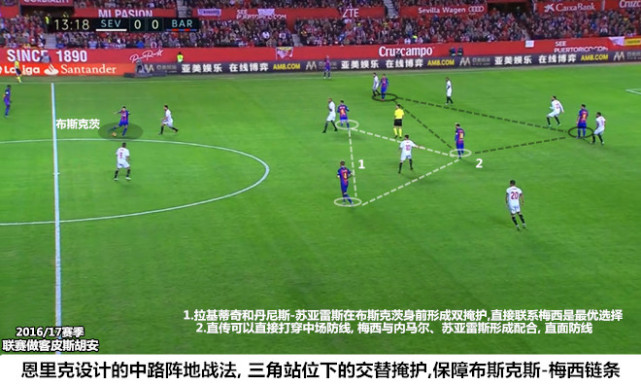 从巴尔韦德近期打造的433切换3412的比赛模式上来看,他显然是从恩里克去季的三中卫试验中汲取了灵感。上赛季后期不受恩里克重用的阿尔巴在新帅麾下重获新生,其与塞梅多的边后卫组合为巴萨带来了强大的后轮驱动力,在两翼齐飞的格局下,布斯克茨更多地沉入双中卫之间承担后场梳理任务,拉基蒂奇落于单后腰位置保护梅西和伊涅斯塔身后的空间,这个后场菱形矩阵的出现保证了球队防守的下限,梅西可以尽情地投入到了进攻中去。