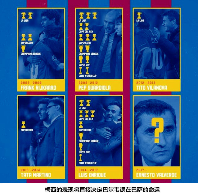 就像同时代的另一位超级巨星C罗一样,梅西也是惊人天赋与后天努力完美结合的产物。梅西的成就建构在日复一日程式化训练的基础上,基于超卓感知和完美预判进行的自我进化,帮助他不断地完善自身的技术细节,主动地适应球队的战术变化。从本质上来说,巴尔韦德对梅西的使用与瓜迪奥拉、恩里克的思路有很多相似之初,不同的是,瓜迪奥拉的“伪9号”试验让巴萨本就十分强大的中场变得更加完美,恩里克将最后一传任务交给梅西是为了维系中场的下限,而巴尔韦德则是真正依靠梅西为核心来重新建设球队,巴萨的整体阵型再次前移到了高位,此举已经不单单是为了便于压迫式反抢,而是要围绕单核主打进攻。