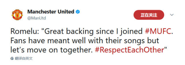 腾讯体育9月22日讯 比利时国脚前锋卢卡库感谢曼联球迷对他的支持,不过这位红魔射手也要求球队死忠能够做到与他“互相尊重”。