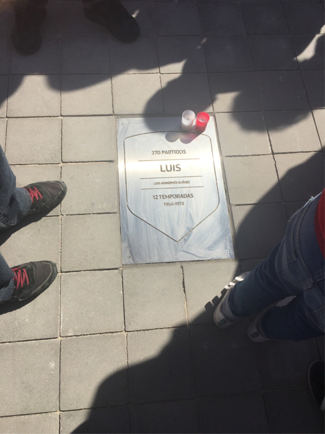 而与之形成鲜明对比的是几步路远外路易斯-阿拉贡内斯,马竞人亲切地称之为阿公的铭牌,干净明亮光可鉴人,马竞球迷为了向他致敬,还专门在右上角摆放了一对红白色的蜡烛。