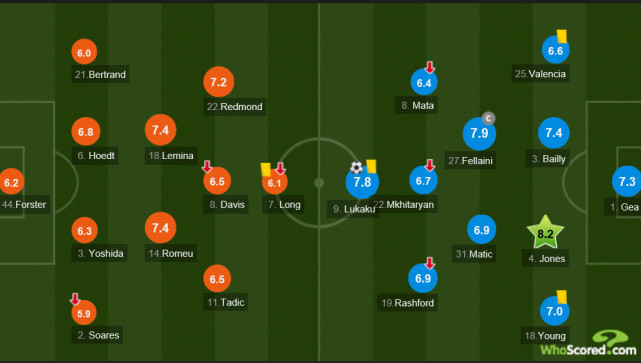边路凶猛反扑便导致一个后果:南安普敦的角球数量激增,从上半场的2次增加到下半场的6次,而曼联上半场有4次,下半场一次也没有!好在费莱尼在门前头球解围,否则罗梅乌利用角球的后点头槌攻门就有可能得手了。