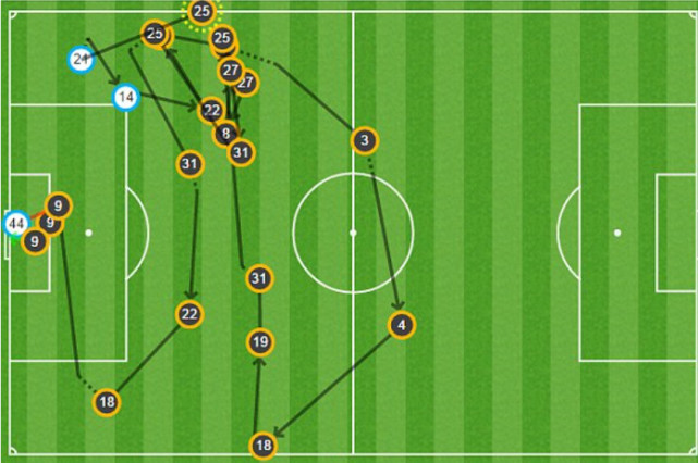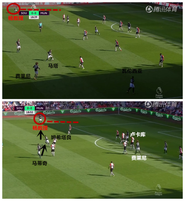 事实上这粒进球就是从右路发起的:瓦伦西亚发右边线界外球,伯特兰断下给罗梅乌,后者传球失误,姆希塔良与瓦伦西、马蒂奇、拜利、马塔、费莱尼等人在右路做连续配合。然后,曼联前后两“腰”的轴心作用展现出来了:马蒂奇与姆希塔良两脚转移,将皮球转到左路空当。“杨教授”接球后切入,假动作晃开塔迪奇,右脚传中。