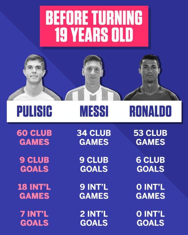 美国的足球发展并没有因为屡次杀入世界杯淘汰赛而顺畅起来,在多诺万之后,该国的足球名将身形基本都能打NBA、NFL,凯勒、弗里德尔和霍华德都是门将,其他位置鲜有球星涌现,35岁比斯利还在为国征战就是力证。人们都寄望普利希奇可以成为美国足球史上第1位巨星,理由很简单:19岁的他比同龄梅西C罗强。梅西19岁时34次为巴萨出战打入9球、9次为阿根廷出战打入2球,C罗崛起更早19岁为葡萄牙体育和曼联出战53次打入6球,可他过19岁生日时还没为葡萄牙国家队进过球。