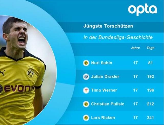 美国小伙的上升势头宛若火箭升空,从他加入多特青训体系,到首次为一线队登场出战德甲,只间隔了11个月:2016年1月30日2015-16赛季第19轮,多特vs因戈施塔特,普利希奇替补登场打了22分钟左边锋,就此完成德甲首秀,那天他只17岁134天。遗憾的是这个年纪不足以创造德甲纪录和队史纪录,只位列多特队史第2,德甲历史第5,沙欣(16岁335天)、德拉克斯勒(17岁117天)、哈维茨(17岁126天)、武克(17岁133天)位列其身前。