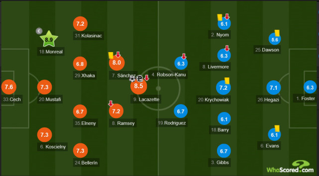 腾讯体育9月26日讯 凭借拉卡泽特的梅开二度,阿森纳主场2-0击败西布朗维奇。本场比赛的一大看点,是拉姆塞顶替厄齐尔出现在右内锋的位置上。跑动和前插是威尔士“死神”的特点,这一点也在比赛中得到充分发挥。但他前插所留下的中场空当,并没有因为埃尔内尼+扎卡双后腰的设置而得到弥补。若非欠缺运气,西布朗本可抓住这一漏洞取得进球。