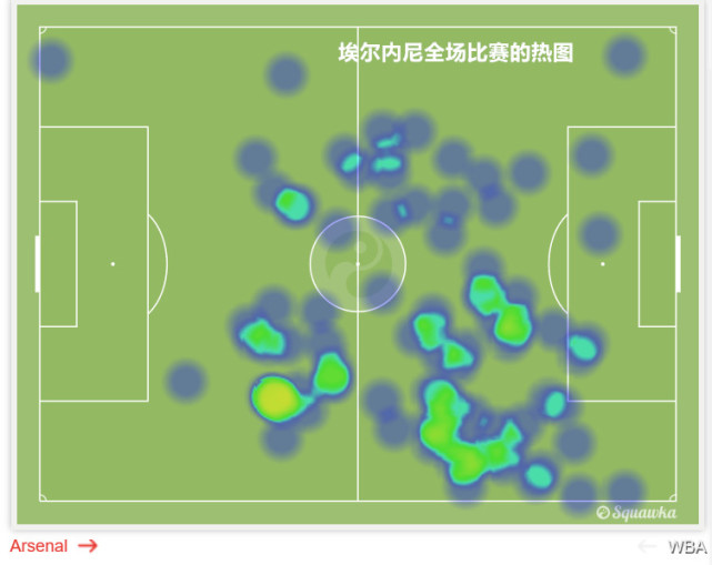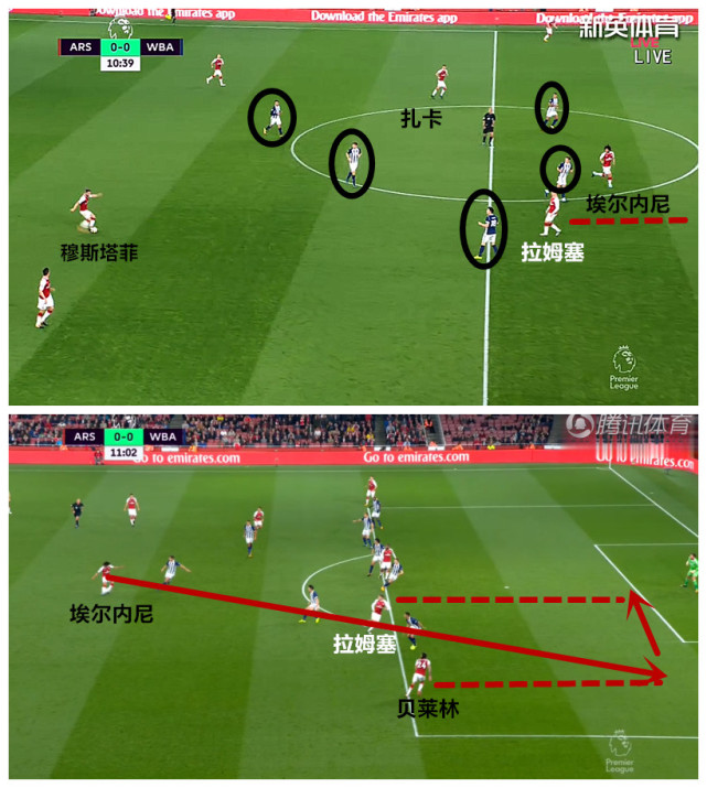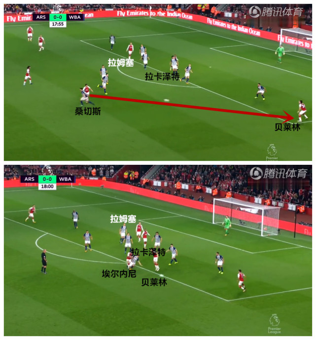 比如阿森纳形成的第1次运动战射门:穆斯塔菲后场拿球,此时西布朗双前锋回防,再加3后腰,在中场形成5人围堵,埃尔内尼和扎卡处于人数劣势,所以拉姆塞撤到中圈准备接应,位置比埃及人还靠后。慕斯一脚长传分到左路后,拉姆塞立刻高速压上,一直杀到对方大禁区线附近。眼见对方左翼卫和左中卫之间出现空当,“死神”继续前插,埃尔内尼过顶球找贝莱林,后者不停球直接端送,正好送到拉姆塞的头上,可惜他的头球攻门顶高。