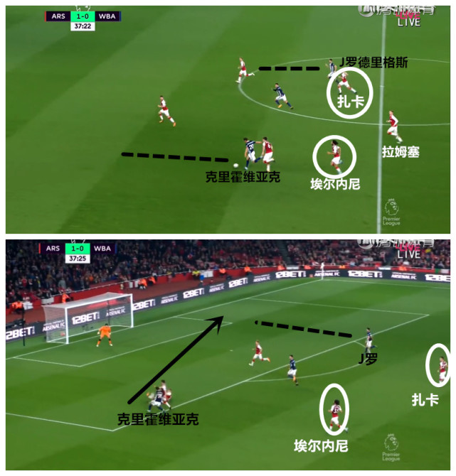 再注意位于图上方的J罗和扎卡,原本前者的身位是落后的,但冲过中线后,他已经超过了瑞士后腰。而与全力冲刺的西布朗前锋相比,扎卡几乎是慢动作回防,结果自然是被越拉越远,眼睁睁的看着对方杀入禁区,接克里霍维亚克的传中头球攻门,若非蒙雷亚尔门线解围,阿森纳就被扳平了。