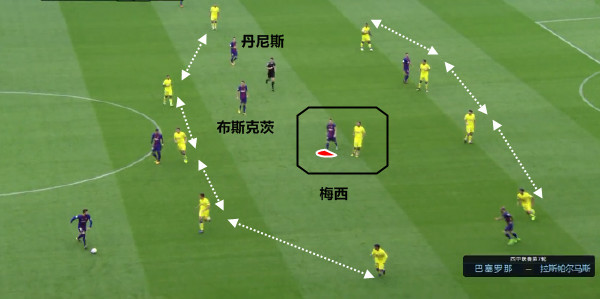 这次拉斯帕尔马斯的防守中,前锋球员卡莱里都已经退防到本方中圈之后的位置。后腰区域,留下一名专门盯防梅西的球员,限制巴萨在中路的进攻发起。由于伊涅斯塔没有出场,巴萨缺乏第二个可以组织进攻的核心点。布斯克茨尝试着位置前移,让保利尼奥拖后。不过这样一来,后场出球找梅西的能力,就进一步下降了。