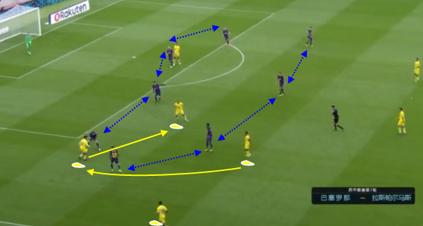 拉斯帕尔马斯在一个边角位置,形成这样3-4人的三角或者四角形站位,针对的就是巴萨方面双前锋梅西和苏亚雷斯不会回防。主队无法象他们一样设置出一个游击型的单后腰负责补漏,从而让拉斯帕尔马斯找到了巴萨中腹的空间,进行接应和梳理传递。