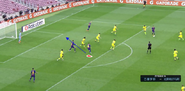 从战术板上可以注意到的是,拉斯帕尔马斯的4141阵型下,防守端全员退防。他们通过安排一名后腰专门限制中路的梅西,取得了不错的防守效果。巴萨方面的进攻发起,很难找到从梅西启动的线路。