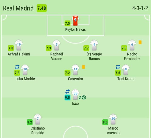 皇家马德里首发:1-纳瓦斯、6-纳乔、4-拉莫斯、5-瓦拉内、19-阿奇拉夫、8-克罗斯(70'17-巴斯克斯)、14-卡塞米罗、10-莫德里奇(82'24-塞瓦略斯)、22-伊斯科(90'21-马约拉尔)、20-阿森西奥、7-C罗