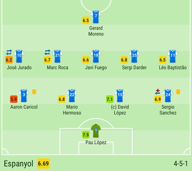 西班牙人首发:1-帕乌-洛佩斯、3-阿伦-马丁、22-埃尔莫索、15-戴维-洛佩斯、24-塞尔吉奥-桑切斯(68'23-格拉内罗)、10-胡拉多(46'9-塞尔吉奥-加西亚)、25-塞尔吉-达德尔、18-富埃戈、21-马克-罗卡(46'2-马克-纳瓦罗)、11-巴普蒂斯唐、7-赫拉德-莫雷诺
