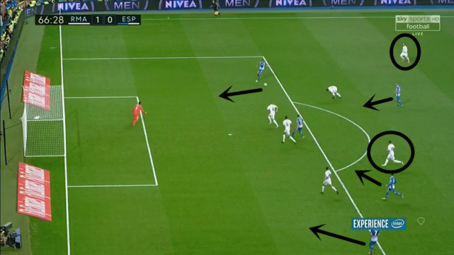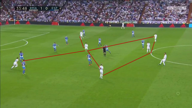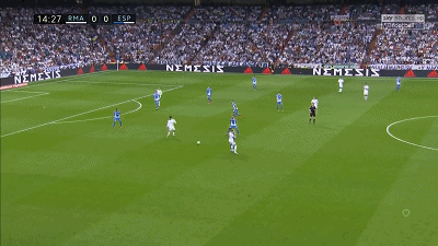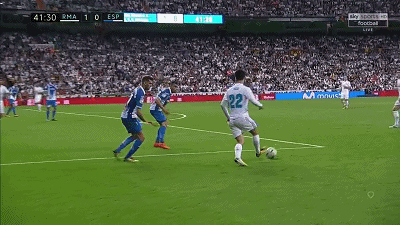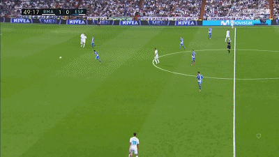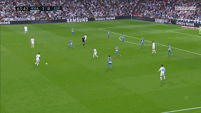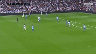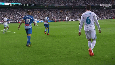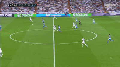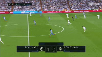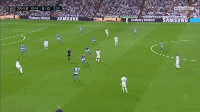 由于替补右边后卫哈基米还没有过一线队首秀经验,皇马的进攻大多在左路展开。克罗斯在中场组织分球,伊斯科持球向前推进的同时纳乔也积极压上,阿森西奥和C罗回撤到左路肋部区域形成小组配合。皇马在开场伊斯科就获得了两次射门的机会,西班牙人的防守还并未真正进入到比赛状态。但开场皇马的强攻让西班牙人逐渐放弃进攻的想法,安心落位防守寻找反击机会。