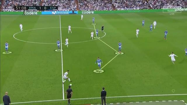 上半场的西班牙人踢得非常保守并且毫无斗志,任由皇马球权自由流动,皇马可以轻松将战火烧到对方三十米区域内,如果上半场把握机会能力好一点皇马完全可以杀死比赛。中场休息过后稍有调整,西班牙人加强了逼抢和跑动,防守阵型也更加立体和紧凑,比赛才慢慢向西甲应有的节奏转变。