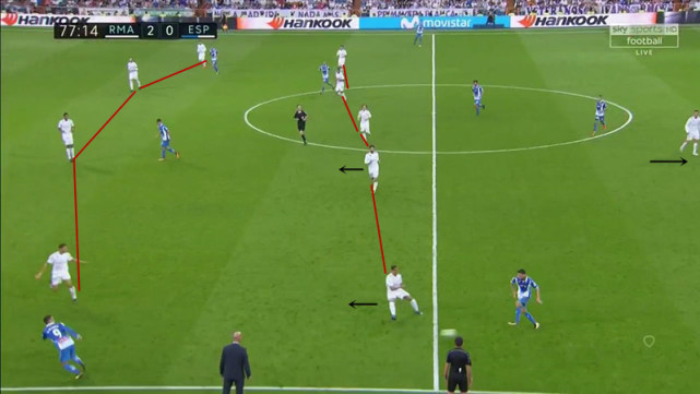 本场颇有如出一辙的意思。伊斯科的第一粒进球来源于C罗在左路肋部发起精妙的直塞,伊斯科默契的插上破门。而第二粒进球伊斯科在抢断后把球交给回到中场参与防守的C罗,皇马迅速形成四打三的局面,C罗带球推进分给阿森西奥,后者再倒三角回做给伊斯科。阿森西奥的助攻和对阵阿拉维斯时给塞瓦略斯的助攻非常相似,这也得益于巴斯克斯替换克罗斯上场后,阿森西奥可以回到左前卫的位置发挥他的有球能力。