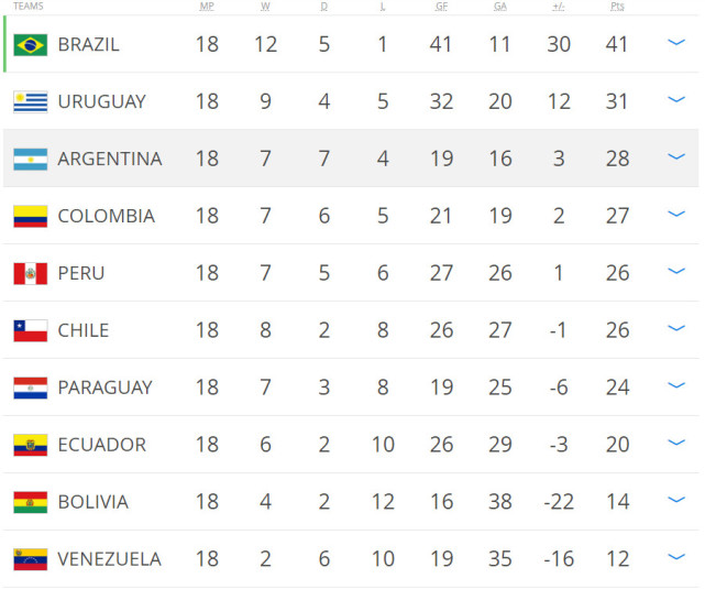 智利队在最后一轮遭遇了强大的巴西,赛前,巴西国内媒体和球迷都在讨论巴西应该向阿根廷还是向智利“放水”。虽然存在这样的讨论,但是巴西还是非常职业,保利尼奥和热苏斯(2球)相继破门,3-0击败了智利。这场比赛的失利让智利付出了惨重的代价,他们最终的积分是26分,比秘鲁少1个净胜球,最终排名第六,附加赛的资格都没有捞到。