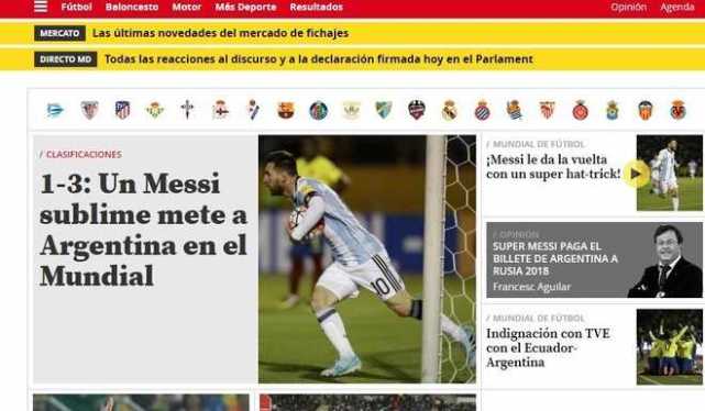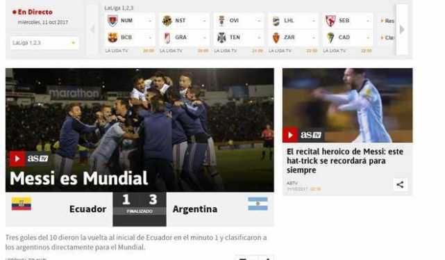 《阿斯报》指出,“梅西的帽子戏法帮助蓝白军团晋级世界杯。这是梅西在国家队最出色的表现,对厄瓜多尔人来说,梅西是无法阻挡的。阿根廷人把全部的希望寄托在梅西的身上,而他的非凡表现也让阿根廷晋级了世界杯。”