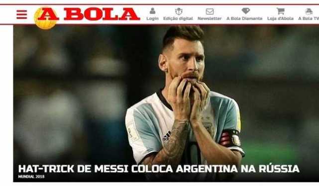 腾讯体育10月11日讯 依靠梅西的帽子戏法,阿根廷最后一轮完胜厄瓜多尔,直接晋级俄罗斯世界杯。梅西的出色表现让全世界各大媒体集体送出了溢美之辞,巴西《环球体育》更是将梅西称作蓝白军团的“救世主”。