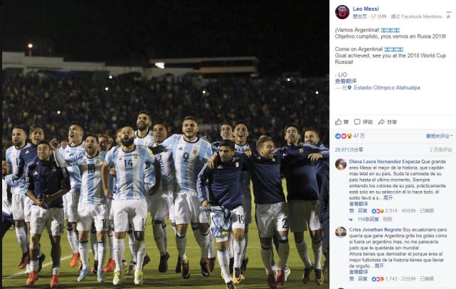 此役之前,阿根廷在南美区仅仅排名第六位,此役只有取胜或战平才有希望晋级。在开场仅仅38秒就丢球的被动局面下,梅西上下半场连入3球,帮助阿根廷逆转取胜,最终跃居第三名,直接晋级世界杯。成功晋级之后,梅西激动的在社交网络表示,“我们实现了目标,2018年,我们在俄罗斯世界杯见。”