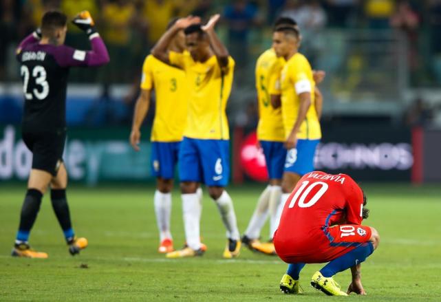 在南美,世界杯入场券的悬念被一直保留到了最后一刻:在第18轮打响之前,除了已经提前锁定头名的巴西,以及至少获得跨大洲附加赛资格的乌拉圭之外,智利、哥伦比亚、秘鲁、阿根廷、巴拉圭都有机会搭上俄罗斯世界杯的末班车,不过这5支球队中注定会有两个倒霉蛋。最终,智利和巴拉圭成为了这两个倒霉蛋:前者在客场0-3完败于巴西,并最终仅列积分榜第6位;后者更是在主场0-1输给了“副班长”委内瑞拉,煮熟的鸭子愣是放飞了。