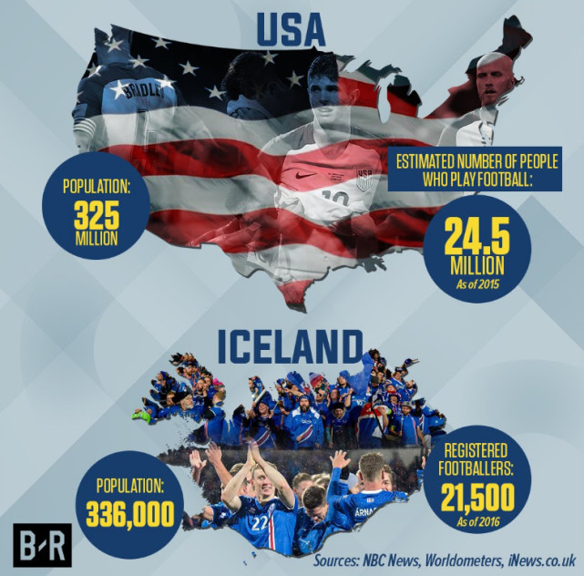 与其相对应的,人口最多的国家队中国再次无缘世界杯,世界头号强国美国,末轮赛前数据分析只有8%可能被淘汰,却真输了生死战,自1986年后首度无缘世界杯。美国人口3.25亿,足球人口就达2450万,冰岛人口仅33万多,注册球员仅2万1500人……但这就是足球奇妙之处,巨无霸倒下,迷你小国却闯荡世界杯。