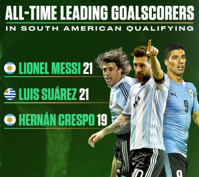 末轮生死战上演帽子戏法的梅西,虽在南美区射手榜上不如卡瓦尼,但其世预赛生涯总进球已达21球,与苏亚雷斯并列历史第1,超越前辈克雷斯波的19球及萨拉斯的18球。