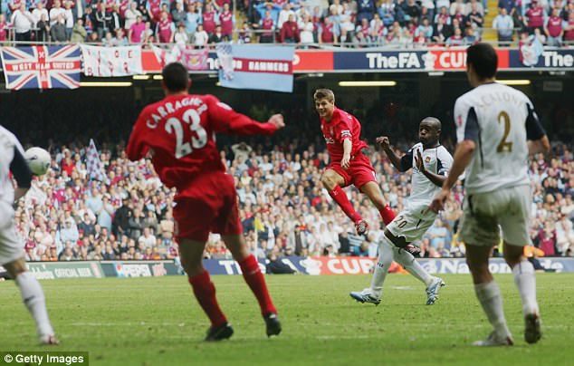 是役,西汉姆联利用卡拉格的乌龙球先拔头筹,紧接着雷纳脱手、西汉姆前锋阿斯顿2-0扩大领先优势。但就在上半时,杰拉德右路长传禁区助攻西塞扳回一城,第54分钟,杰队在禁区内的混战中暴力怒射将比分扳为2-2。可惜好景不长,几分钟后孔切斯基左路吊射再度将比分改写为3-2,利物浦陷入绝境。伤停补时阶段,杰拉德距离球门35米开外轰入超级低平世界波,皮球直入球门左下死角3-3,杰拉德为红军续命。最终,利物浦凭借点球大战赢下西汉姆,26岁的杰拉德几以一己之力为利物浦捧得足总杯。