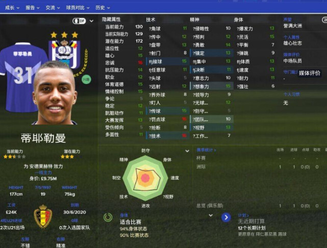 当然如果蒂莱曼斯的定位不是一个b2b而是专门的组织型中场或者后腰,那么蒂莱曼斯需要加强的是身体对抗能力和相对速度的提升。毕竟在未来越来越激烈的比赛中,身体和速度以及跑动覆盖面也是一个好的中场能否成为球队核心的关键。目前这位在摩纳哥这位比利时小将依然发挥惊艳,目前他已经跟随摩纳哥参加了联赛、杯赛以及欧冠的比赛。上场次数越来越多,进球也已经开了胡,助攻也刷了一次。假以时日,他又将是摩纳哥“黑店”出品一大“妖星”,摩纳哥总监现在肯定像很多FM资深玩家一样心里美滋滋吧!