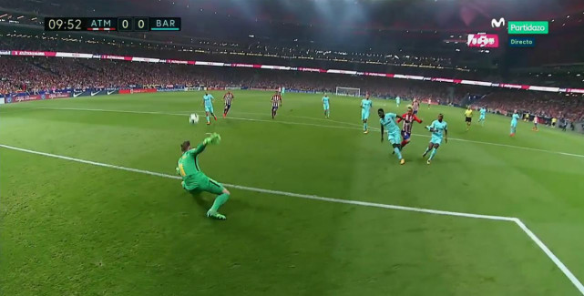 前10分钟格列兹曼就有两次得分良机,先是巴萨后场传球失误,安赫尔-科雷亚给法国人送出直塞,随后又是皮克赌博性地倒地铲抢,被格列兹曼人球分过甩掉。短短1分钟内,马竞一哥两次获得禁区内射门良机,都险些进球,可他无论射近角还是远角,也都被特尔施特根神勇封出,后一次伸腿将贴地低射封出,尤其难度巨大。名宿帕科-冈萨雷斯也说:“梅西开场15秒差点进球后,格列兹曼这两次机会最接近改写比分。”