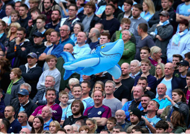 而在今天阿提哈德球场的看台上,自然也少不了鲨鱼们上下翻腾飞舞的场景:大的小的,蓝的灰的,戴头上的,抱怀里的,各式各样,应接不暇。