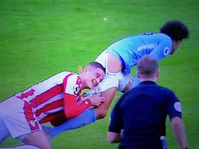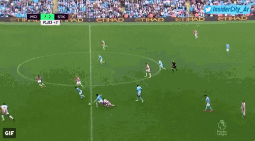 虽然7-2领先,但是曼城依旧不依不饶,在伤停补时阶段继续发起强攻。萨内在中场得球后强行突破,斯托克城球员阿费莱在萨内的身后,根本无法追上萨内的步伐,因此这位前巴萨球员伸出了手,抓住了萨内的球裤,萨内被拉倒在地。