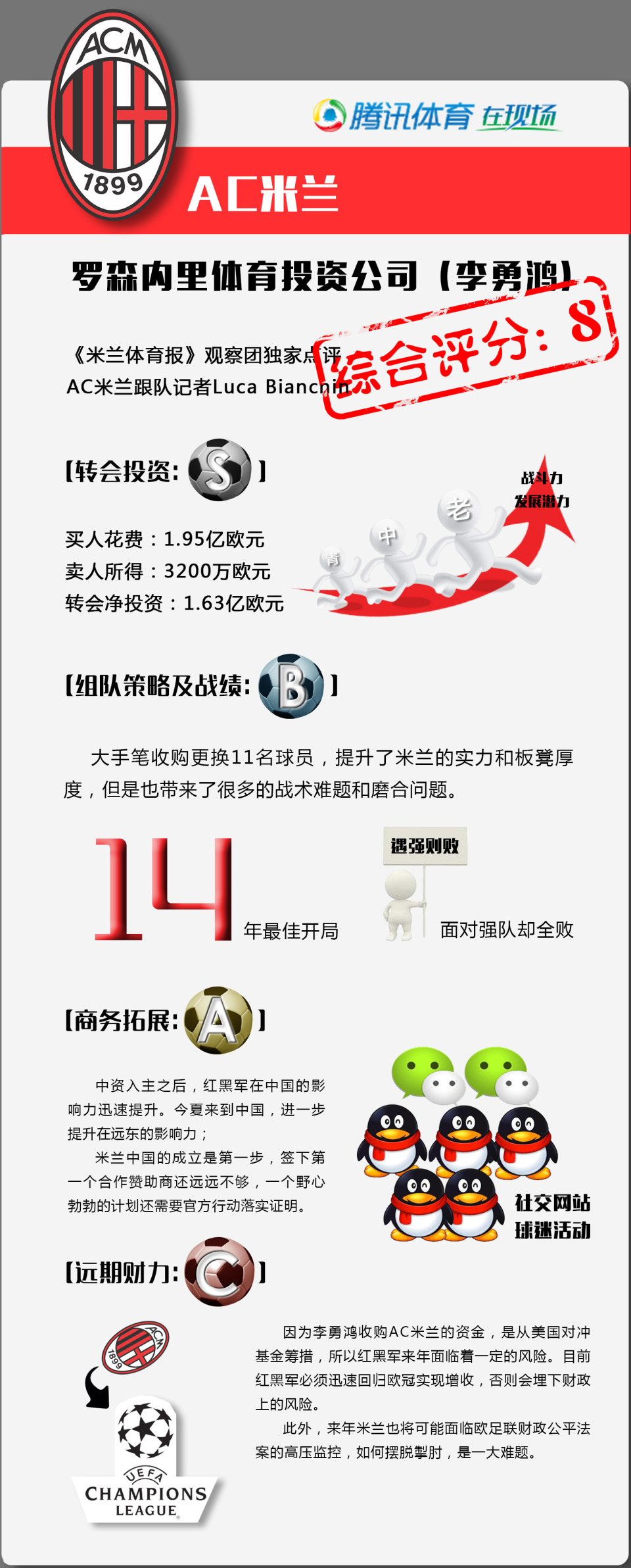 社会影响:8分 米兰非常重视和球迷的对话,球员更多地通过社交媒体和球迷接触,而不是通过新闻发布会和记者,转会总结也是以一场和球迷之间的问答结束的,体育主管米拉贝利刚刚开通了推特账号,新浪微博球员们亮相的视频也得到了球迷广泛的关注和讨论。